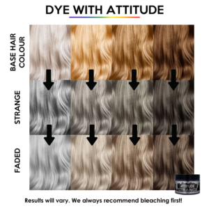 Strange grey hair dye will unleash your peculiar side! This highly pigmented grey shade has strong blue undertones and the result will depend on your base colour. Like most of our colours, Strange turns out most accurately on pre-bleached hair to at least level 9 (light blonde) with neutral undertones. Because of the blue undertones, Strange might turn out greenish on hair with yellow undertones.